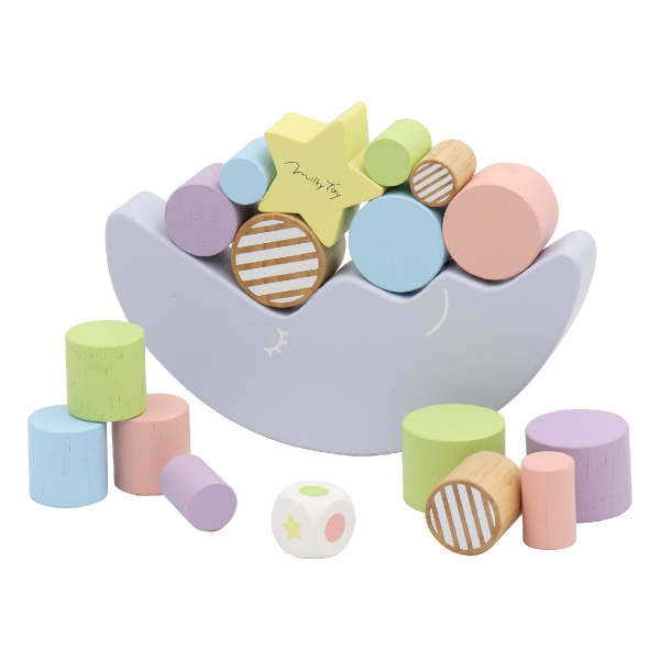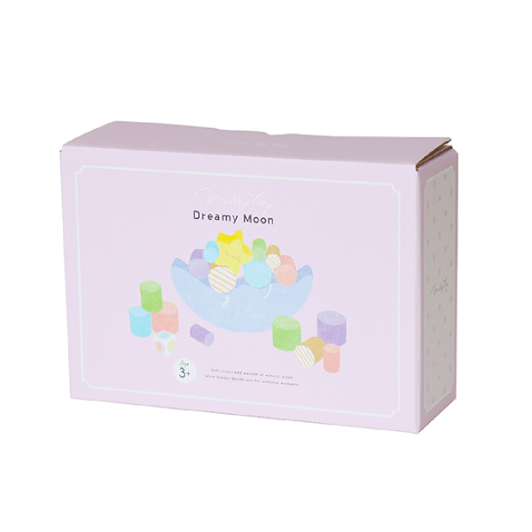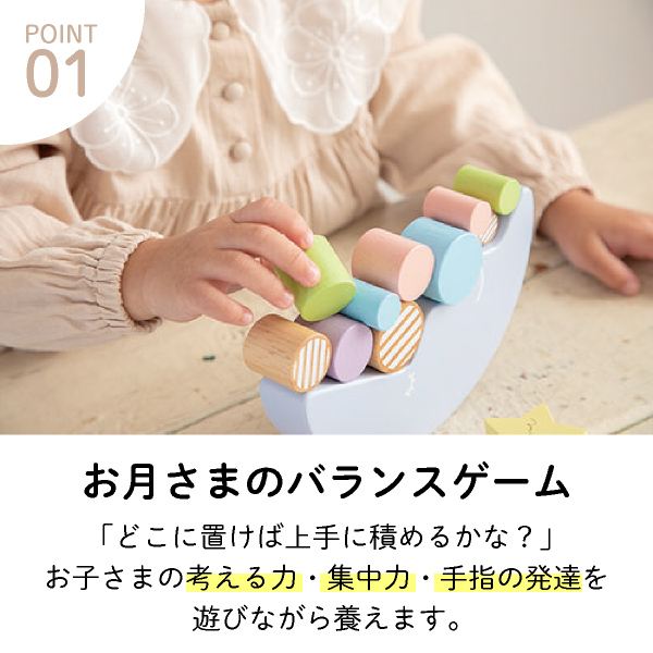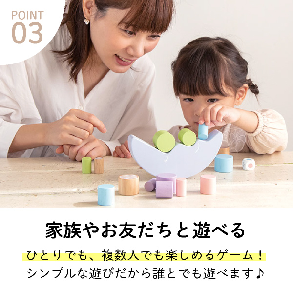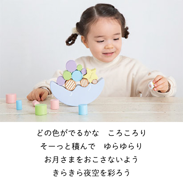 大人気ロングセラー「お月さまバランスゲーム」がMilky Toy仕様のかわいいデザインになって仲間入り♪ サイコロを転がして出た色のブロックをお月さまに乗せていき、ブロックが落ちたら負け!おともだちやご家族で楽しめるバランスゲームです。 ブロックは積み木としても楽しめます。遊び終わったらお片付けができる収納袋つき。