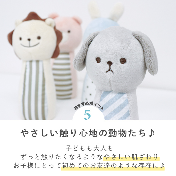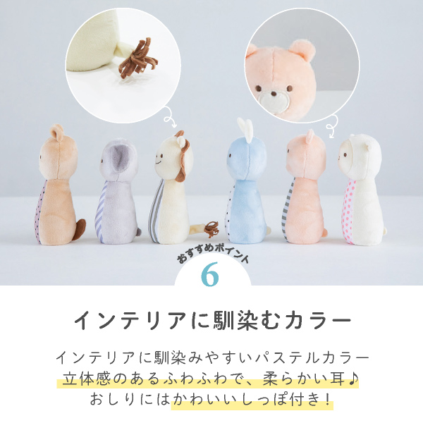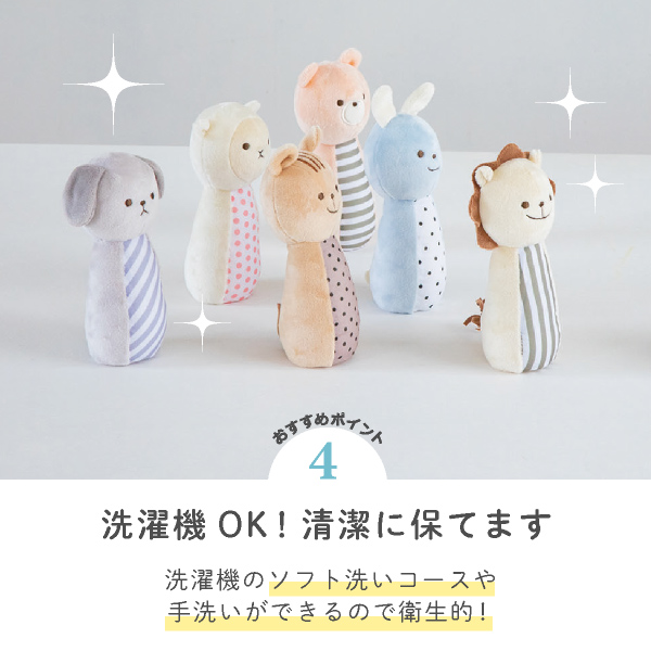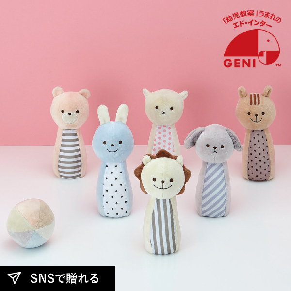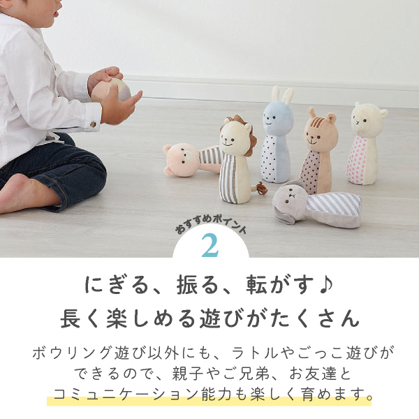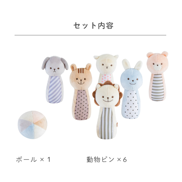 優しいカラーの動物たちの可愛いピンは、ボウリングをしてはもちろん振ると優しい音色を奏でてくれるので単体で遊んでも楽しい♪
