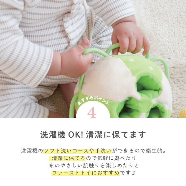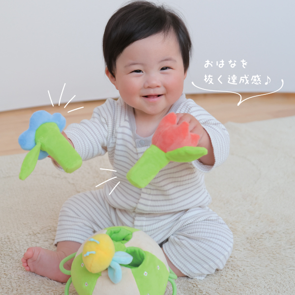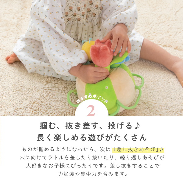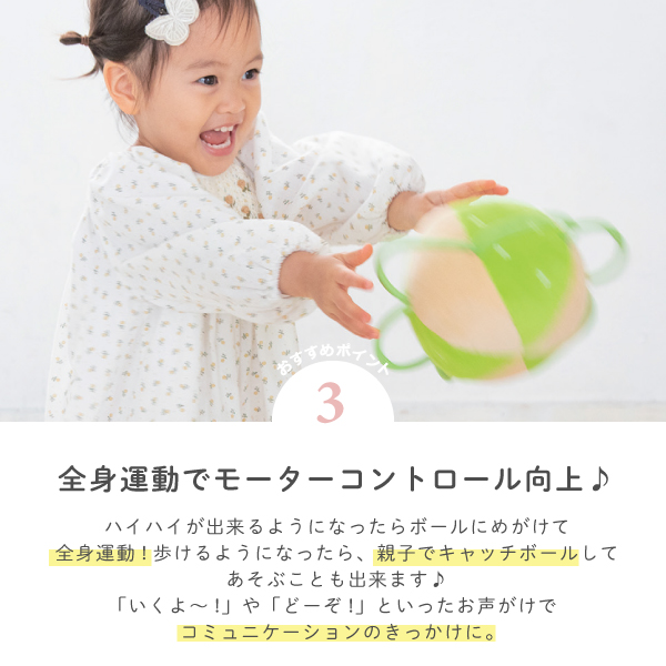 物がつかめるようになると、ラトルを引っこ抜いたり指先の運動にもぴったり!ママパパと一緒にボール投げをして楽しみながら全身運動をすることもでき、運動能力の向上へと導きます。