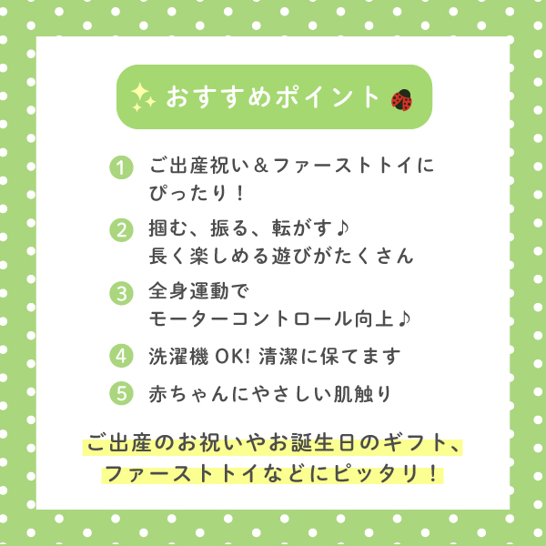 男女共に贈りやすいデザインで、友人への出産祝いやファーストトイにおすすめな知育玩具です。
