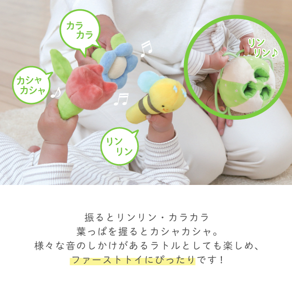 赤ちゃんは音のなるおもちゃが大好き。葉っぱを握るとシャカシャカ、振るとリンリン色んな音を楽しむことができます。音の仕掛けは聴覚を刺激し脳の発達を促してくれます。