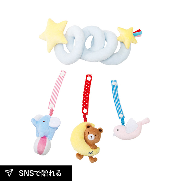 ベビーカーやベッドに取り付け可能なソフトプレイジム。動物のぬいぐるみは取り外してガラガラとしても遊べ、知育と遊びを兼ね備えた多機能セット。赤ちゃんの好奇心を育て、出産祝いなど特別な贈りものとして喜ばれるギフトです。
