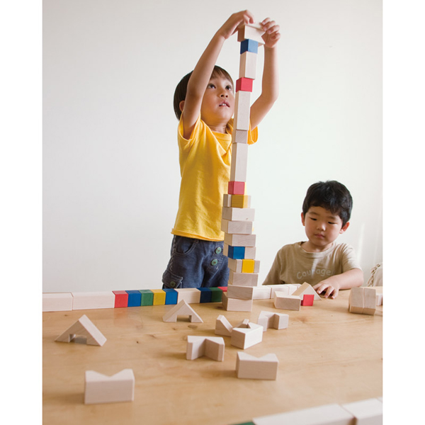 CUBICOLOは3cm基尺の積み木です。赤、青、黄、緑色のアクセントパーツがあるので、色彩構成が楽しめるメリットも。月齢や年齢が上がるにつれ、積み木を並べて線路や道路を作って遊んだり、おうちを作ってみたり、想像力を働かせて遊ぶことができます。