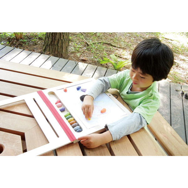 MUSEOは子どもの豊かな成長を促す、お絵描きの時間をスマート&シンプルにできる画板です。付属のクレヨンは握力の弱い小さな子どもの手でも持ちやすい形状になっており、素材も安心、安全にこだわった天然素材を採用しています。