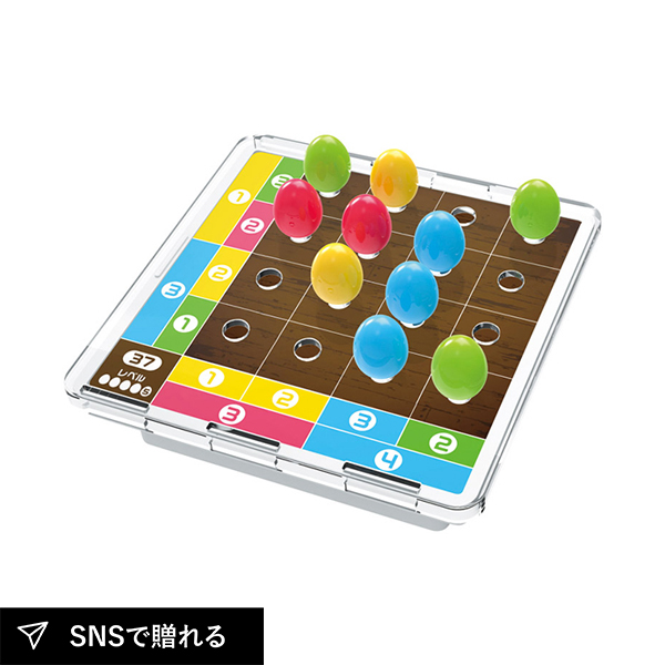問題カードのタテ列とヨコ列の数と色のヒントをもとに、16個のピースを正しい場所に配置するパズルゲームです。誰でもできそうなものでも最初に行うのは難しいというコロンブスのタマゴの逸話をモチーフにしています。
