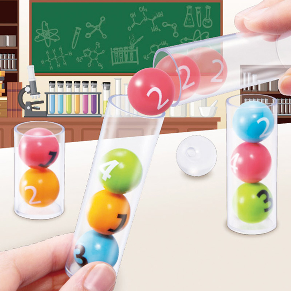 試験管の球をどのように移動させるか考えることで、論理的思考能力を育みます。立体的に考える3目並べなどの対戦ゲームなど3種のゲームもできるので、一人でも家族や友達とも一緒に楽しむことができます。