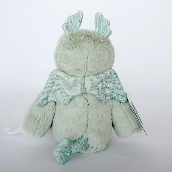 ツノや羽根、しっぽにはラメ加工が施され、淡いグリーンの輝きが上品なアクセントに。