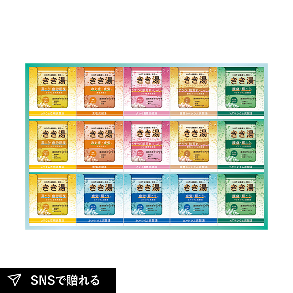 多彩な香りと温浴効果が楽しめる温泉科学プロジェクトで開発されたバスクリン「きき湯」のギフトセット。贈る方の日々のバスタイムを特別な時間にし、心身をリフレッシュさせるプレゼントに最適です。