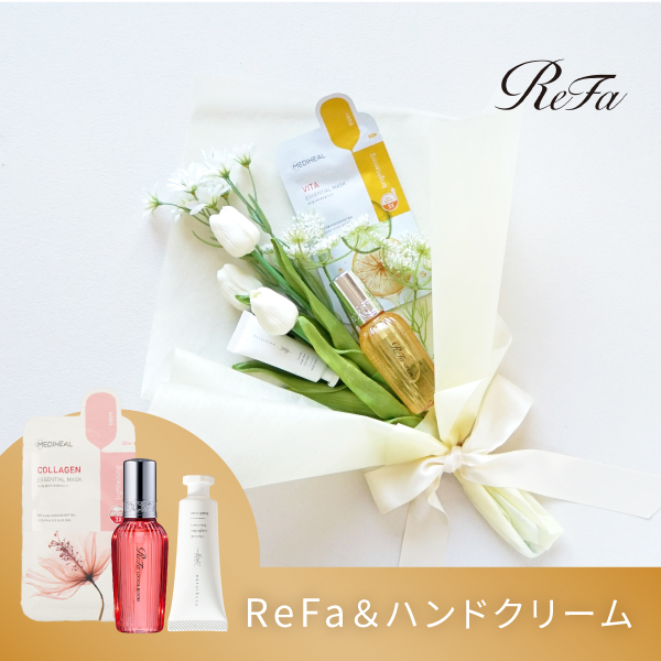 | 【コスメ】 ・メディヒール ビタ エッセンシャルマスク 1枚 ・ナチュセラハンドクリーム 1本 ・ReFa ロックオイル R 100mL 1本 【ブーケ】 ・アーティフィシャルフラワー(ホワイトチューリップ系) ・不織布ラッピング ※2色からお好きなものをお選びいただけます。 |