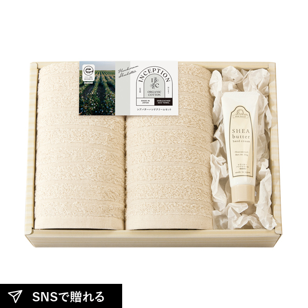 | フェイスタオル2P(約32×75cm)、シアバターハンドクリーム(30g) |