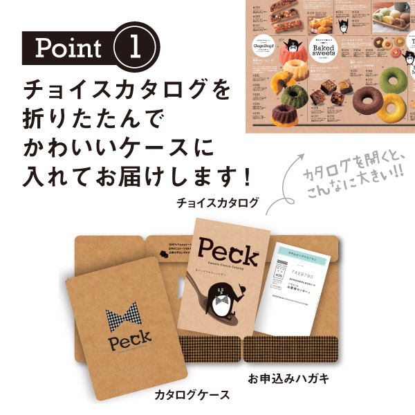 チョイスカタログの中から「好きなモノ、食べてみたいモノ」を自由にチョイスして自分だけのスイーツセットを作れたら。そんな視点で生まれた新しいギフトのカタチ、それが「PECK」です。