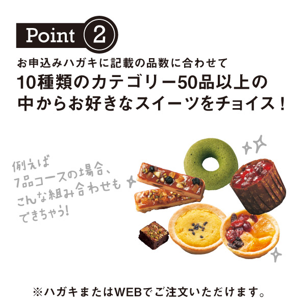 50品以上の中から、好きなモノをちょっとずつ選べるスイーツチョイスカタログ。