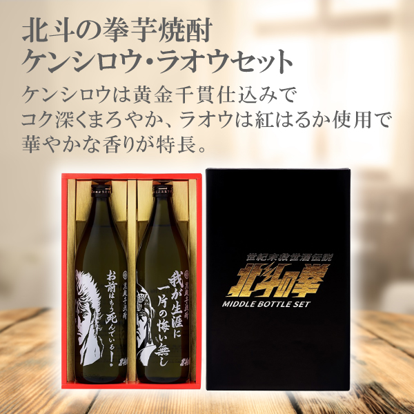 北斗の拳好きにはたまらないコラボ芋焼酎セット2組入り。ケンシロウは黄金千貫仕込みでコク深くまろやか、ラオウは紅はるか使用で華やかな香りが楽しめる贅沢な4本セットです。