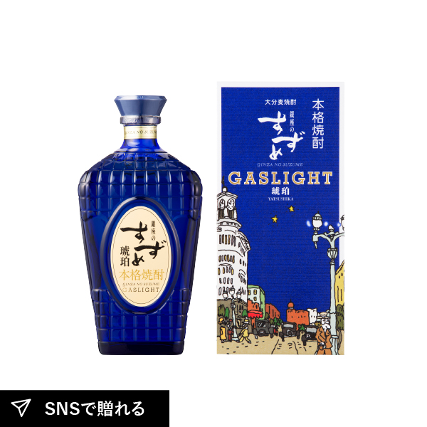 銀座のガス灯をイメージした美しいベネチアンブルーのボトル入り。バーボン樽で長期熟成した麦焼酎で、まろやかで上品な口当たり。スモーキーな深い味わいはお酒好きな人に喜ばれ、贈答にもぴったりです。