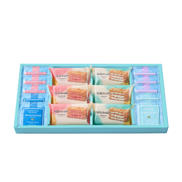 国産小麦100%のパイ生地に、バニラとフランボワーズの2種のクリームをサンドしたミルフイユと、ウェッジウッドの紅茶4種をセットにしました。サクサクのパイと風味豊かなクリーム、そして紅茶の芳醇な香りが口の中に広がる、贅沢なティータイムをお楽しみください。