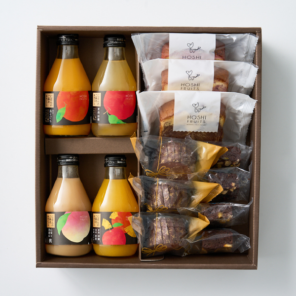 | ジュース(山口島そだち・青森林檎・山梨 和歌山桃・ミックスジュース(国産蜜柑・沖縄パイン・青森林檎))×各1本 各180ml、カップケーキ(オレンジ・マロン・パインココナッツ)×各1個、パウンドケーキ(オレンジピール×チョコ・ブルーベリー×クリームチーズ・いちご×アールグレイ)×各1個、ブラウニー(ネーブル・パイナップル・ドライフルーツ&ナッツ・ピスタチオ&アーモンド)×各1個 |