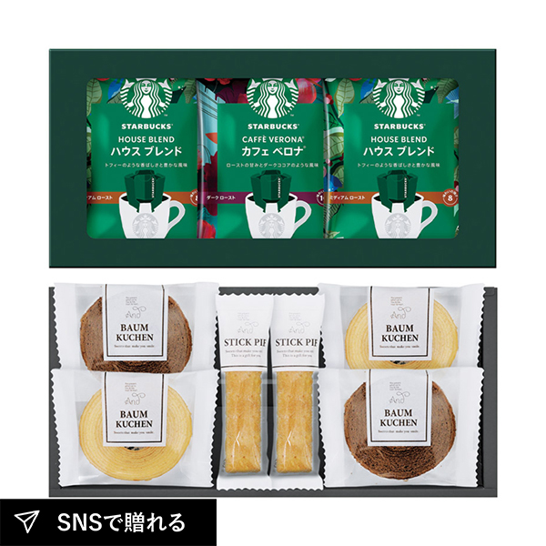 | スターバックスオリガミドリップコーヒー(ハウスブレンド)×3、スターバックスオリガミドリップコーヒー(カフェベロナ)・バウムクーヘン(ココア・バニラ)・スティックパイ(プレーン)×各2 |