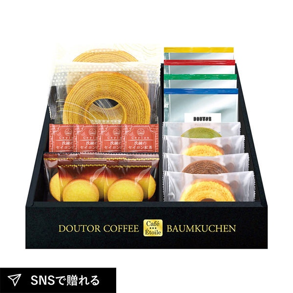| ミルクバウムクーヘン・ミニバウムクーヘン(北海道生クリーム)×各2、プレーンクッキー×5、ドトールドリップコーヒー(深煎りブレンド・キリマンジャロブレンド・モカドブレンド・アロマブレンド)(7g)・ミニバウムクーヘン(宇治抹茶・ベルギーショコラ)×各1、セイロン紅茶ティーバッグ×4 |
