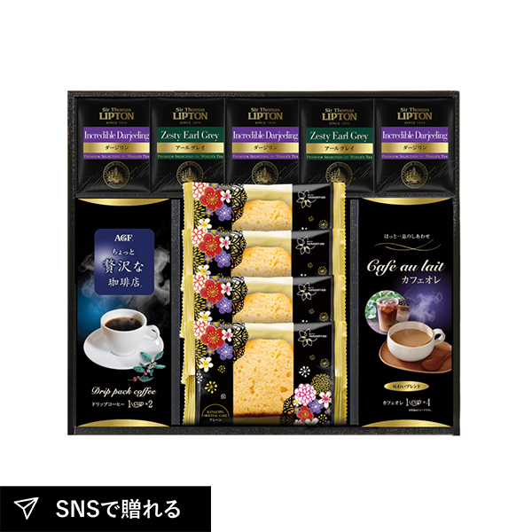 | AGFちょっと贅沢な珈琲店スペシャルブレンド(7g×2)・カフェオレ(12g×4)×各1、サー・トーマス・リプトン ダージリンティーバッグ2.2g×3、サー・トーマス・リプトン アールグレイティーバッグ2.1g×2、金澤兼六製菓オリジナルケーキ(プレーン)×4 |