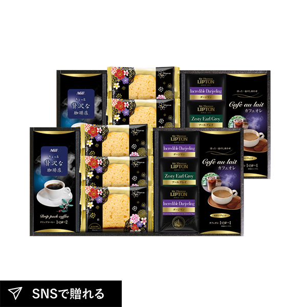 | AGFちょっと贅沢な珈琲店スペシャルブレンド(7g×2)・サー・トーマス・リプトン アールグレイティーバッグ2.1g・カフェオレ(12g×4)×各2、サー・トーマス・リプトン ダージリンティーバッグ2.2g×4、金澤兼六製菓オリジナルケーキ(プレーン)×6 |