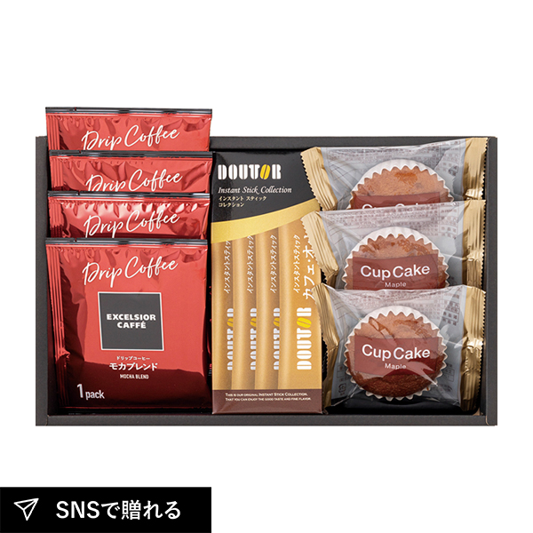 | エクセルシオールカフェドリップコーヒー(モカブレンド8g)×4、カップケーキ(メープル)×3、ドトールインスタントスティックカフェオレ(9.5g×4本入)×1 |