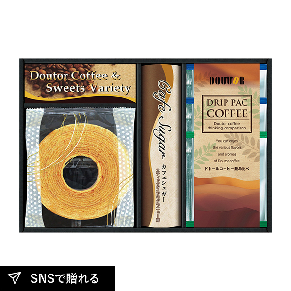 | ミルクバウムクーヘン・ドトールドリップコーヒー(キリマンジャロブレンド7g)×各1、ドトールドリップコーヒー(深煎りブレンド7g)×2、スティックシュガー3g×5 |