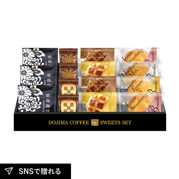 | 堂島珈琲ドリップコーヒー8g×3、あまおう苺ブッセ・ベルギーワッフル(プレーン・ショコラ)・クッキー(コーヒー・チェス)×各2、ブッセ(瀬戸内レモン・北海道ミルク)×各1 |