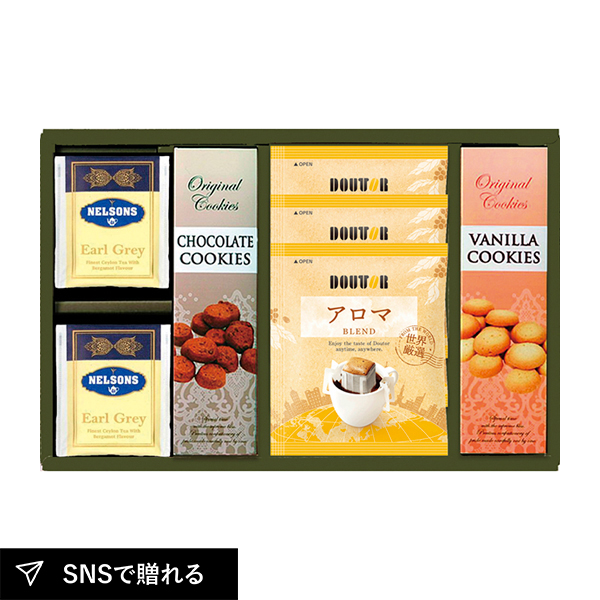 | ドトールドリップコーヒーアロマブレンド7g×3、アールグレイ紅茶ティーバッグ(NELSONS)2g×12、チョコクッキー30g・バニラクッキー30g×各1 |