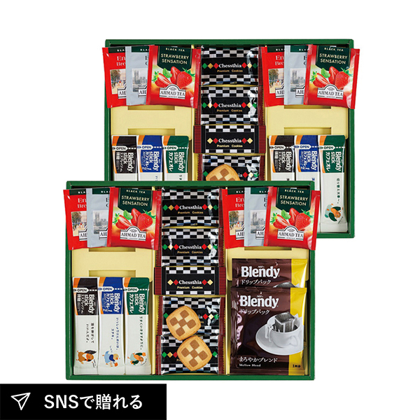 | チェスティアクッキー×8、AGFブレンディコーヒードリップ式7g×2、紅茶(アールグレイ・イングリッシュブレックファースト・ストロベリー)2g×各4、AGFブレンディスティック(エスプレッソ・オレ5.8g・カフェオレカロリーハーフ5.4g・カフェオレ8.2g)×各3 |