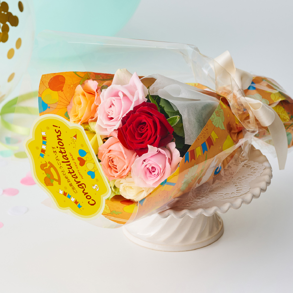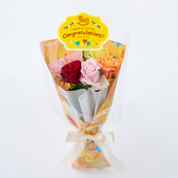 幸せに満ちた空間を明るくやさしく彩る、フレッシュなバラの贈りもの。ママやご家族への想いも込めた出産祝に。
