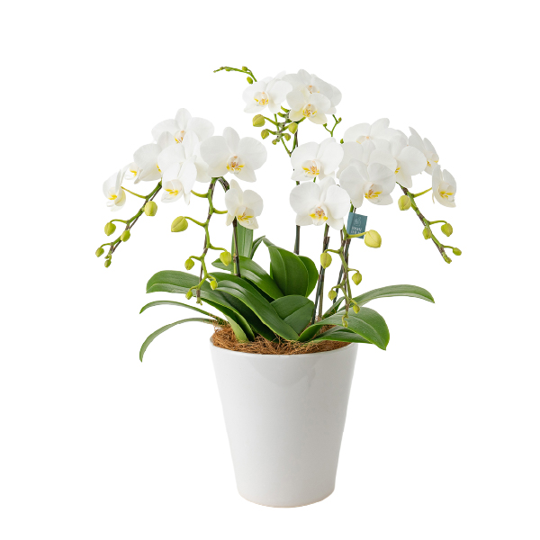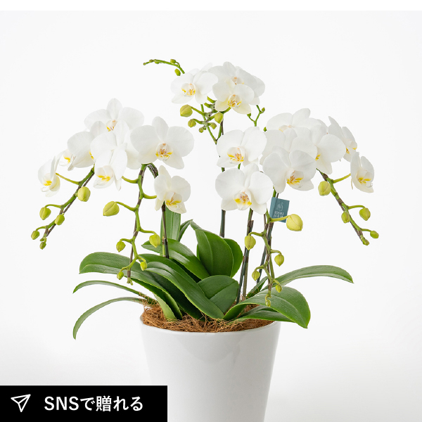 山口県柳井市で丁寧に育てられた、お祝、記念日におすすめのミディ胡蝶蘭です。清楚な雰囲気漂う白系のミディ胡蝶蘭を、インテリアに映える程よい大きさに仕立てています。ギフトシーンを可憐に彩ります。