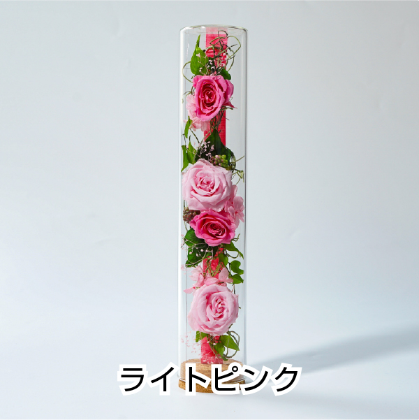 コルクガラスの花器にプリザの鮮やかさが映えるアレンジです。華やかな3色展開。お気に入りのカラーを選んで!