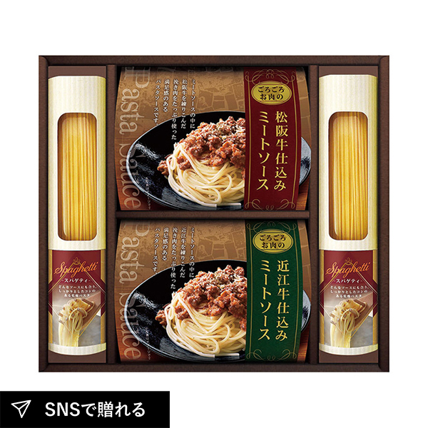 | スパゲティ(100g)×2、松阪牛仕込みごろごろミートソース(150g)・近江牛仕込みごろごろミートソース(150g)×各1 |