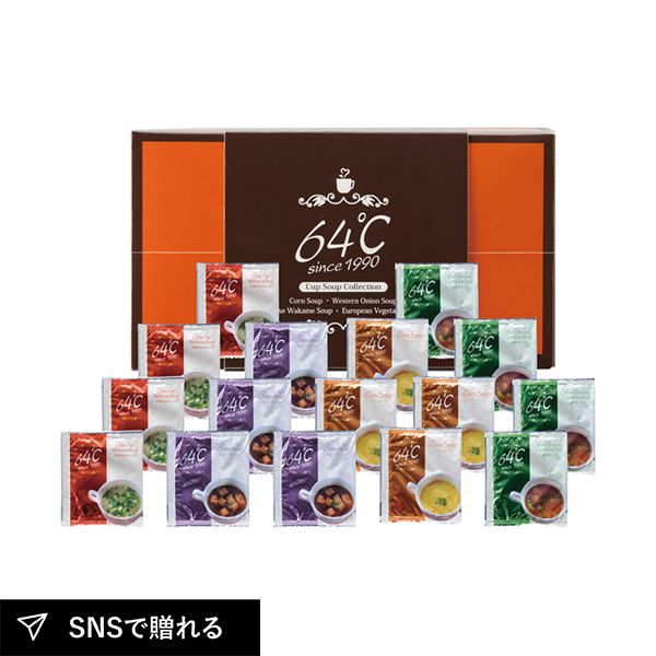 ”おいしさを最も感じる温度“にこだわった64℃のスープセット。コーン、中華わかめ、洋風オニオン、欧風野菜の4種を楽しめ、体をやさしく温める味わいが魅力です。ほっと一息つく時間を届ける、心温まる贈り物として喜ばれます。