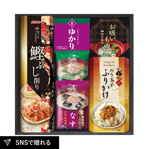 お湯を注ぐだけで出来たての美味しさを楽しめる即席お味噌汁に、毎日の食卓に嬉しい和の味を詰合せました。上品なパッケージで贈り物にも最適です。