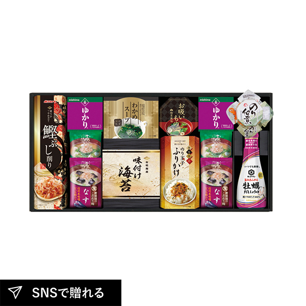 | マルトモ即席みそ汁(ほうれん草7.5g・なす7.4g)・三島食品ゆかりスティックタイプ(1.7g×4)×各2、マルモト鰹ぶし削り(2g×3)・わかめスープ(5.3g×2)・有明海産味付け海苔(8切6枚×2)・永谷園お吸いもの松茸風味(2.3g×2)・のり玉子ふりかけ(4.5g×2)・島の香のり佃煮80g・キッコーマン牡蠣だししょうゆ200ml×各1 |