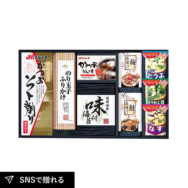 | アマノおみそ汁(とうふ10g・ほうれん草7g・なす9.5g)・マルトモかつおソフト削り(2g×4)・マルトモかつおだしの素(4g×4)・のり玉子ふりかけ(4.5g×3)・有明海産味付海苔(8切6枚×2)・梅茶漬け(4.3g×2)・鮭茶漬け(4.7g×2)×各1 |