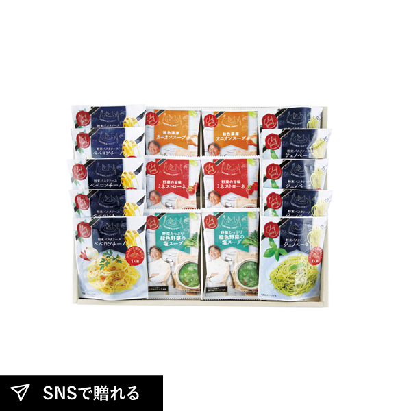 | オニオンスープ・ミネストローネ・緑色野菜の塩スープ×各2、粉末パスタソース(ジェノベーゼ・ペペロンチーノ)×各5 |