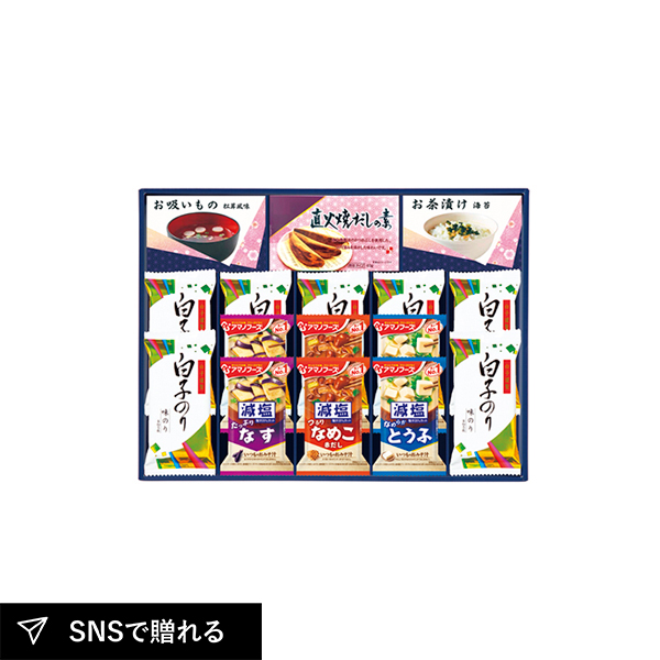 | 白子のり味のり(8切5枚)×7、減塩いつものおみそ汁(なす)9g・減塩いつものおみそ汁(とうふ)10.3g・減塩いつものおみそ汁(なめこ)8g×各2、永谷園お茶づけ海苔(4.7g×3)・永谷園お吸いもの松茸風味(2.3g×3)・だしの素(10g×4)×各1 |
