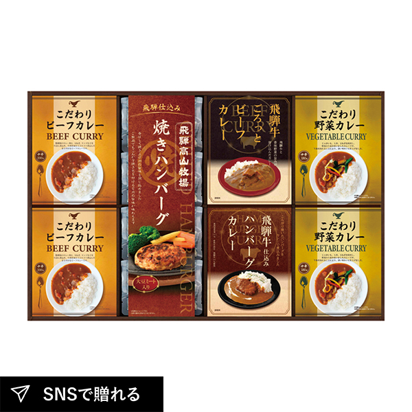 | 焼きハンバーグ100g×4、こだわりビーフカレー180g・こだわり野菜カレー180g×各2、飛騨牛ビーフカレー190g・飛騨牛入りハンバーグカレー190g×各1 |