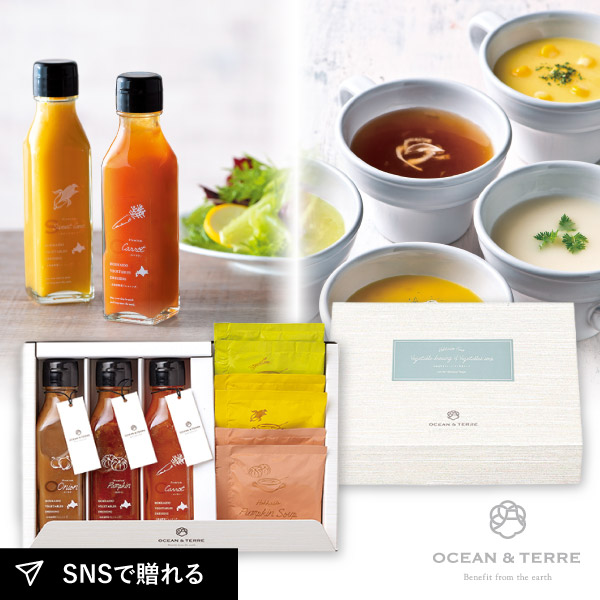 | 野菜ドレッシングオニオン120ml×1、野菜ドレッシングパンプキン120ml×1、野菜ドレッシングキャロット120ml×1、北海道産かぼちゃスープ16.5g×2、北海道産スイートコーンスープ16.5g×2、北海道産アスパラスープ16.5g×2 |