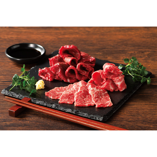 | ふじ馬刺し上赤身(80g)・ふじ馬刺し中トロ(80g)×各1、馬刺し用たれ(5ml)・生姜小袋(3g)×各4 |