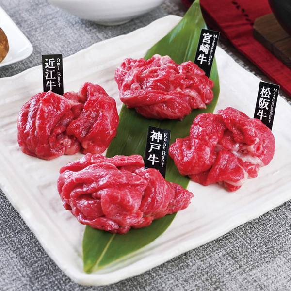 | 神戸牛モモ(60g)・松阪牛モモ(60g)・近江牛モモ(60g)・宮崎牛モモ(60g)×各1 |