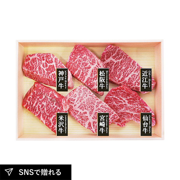 | 神戸牛モモ(60g)・松阪牛モモ(60g)・近江牛モモ(60g)・米沢牛モモ(60g)・宮崎牛モモ(60g)・仙台牛モモ(60g)×各1 |