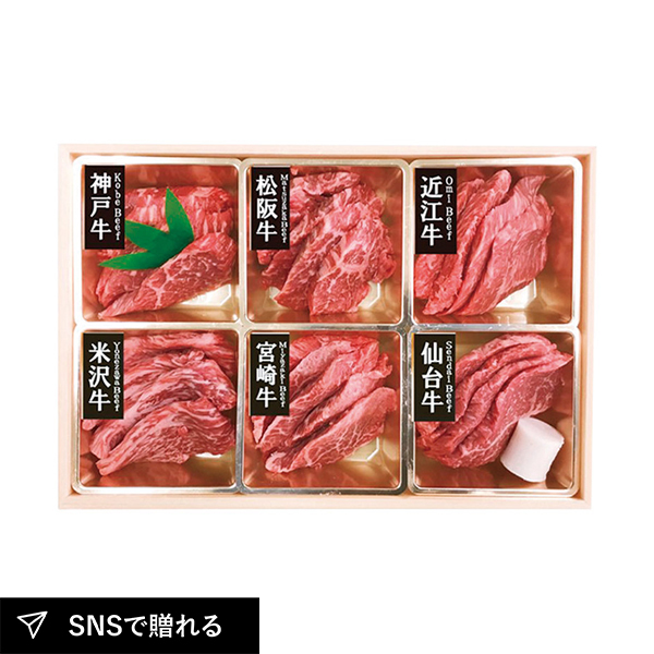 | 神戸牛モモ肉(60g)・松阪牛モモ肉(60g)・近江牛モモ肉(60g)・米沢牛モモ肉(60g)・仙台牛モモ肉(60g)・宮崎牛モモ肉(60g) |
