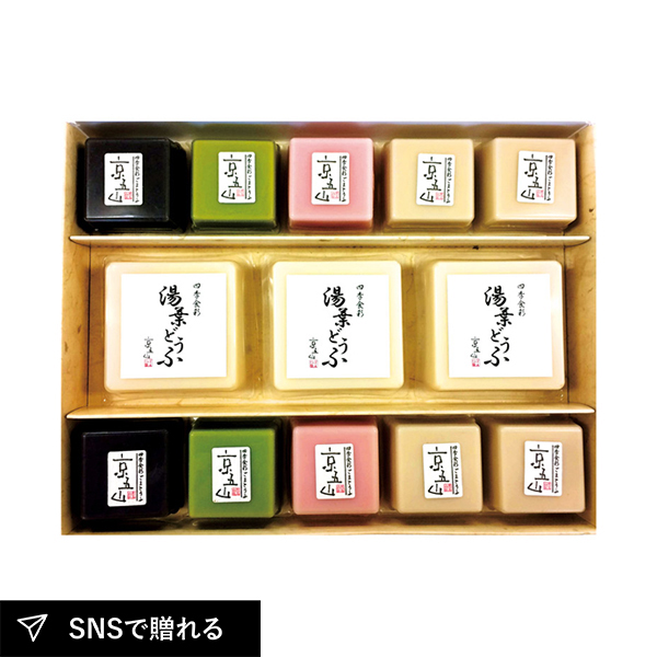 | 湯葉どうふ(100g)×3、ごまとうふ(白)(50g)×4、ごまとうふ(黒・抹茶・しそ)(50g)×各2、ごま醤油ジュレ(5g)×5 |
