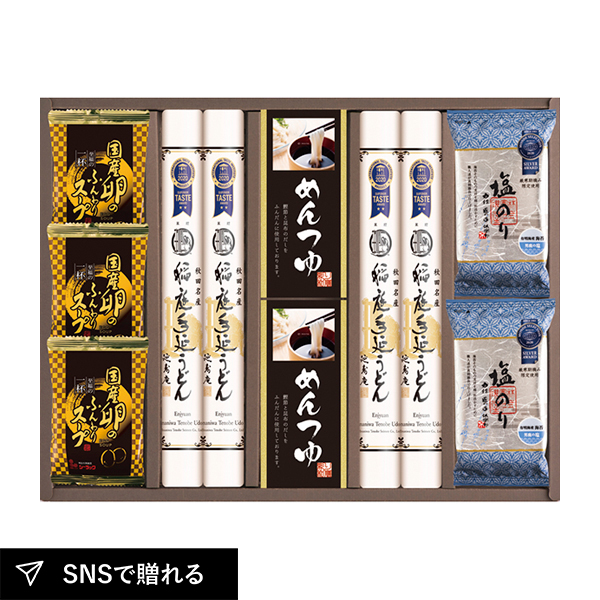 | 稲庭うどん100g・だしつゆ24ml×各4、たまごスープ×3、塩海苔(8切6枚)×2 |