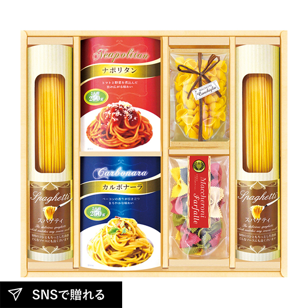 彩食ファクトリーのこだわりが光る日本ブランドのパスタギフト。スパゲティに加え、カルボナーラとナポリタンのソースや彩りパスタを詰合せました。簡単調理で満足感のある味わいが広がり、手土産として喜ばれる特別感のあるグルメギフトです。