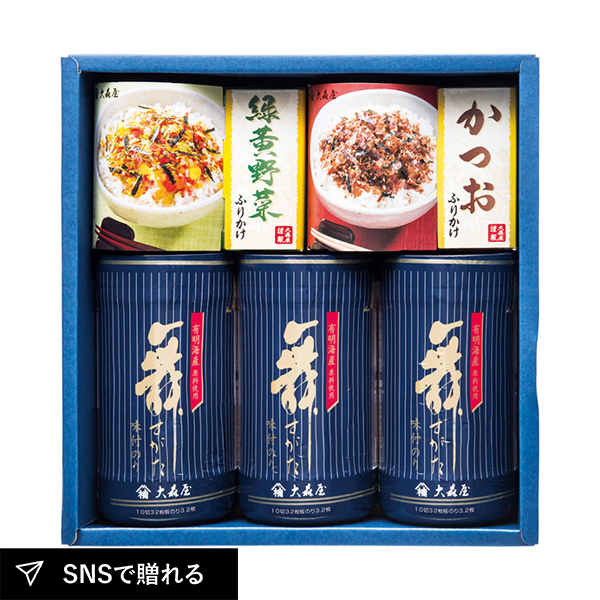 有明海産卓上味付のり・ふりかけを詰合せたパーソナルギフトです。味付のりと緑黄野菜ふりかけ・かつおふりかけのセットです。幅広い年齢層の方に喜んでいただけること間違いなしのセットです。
