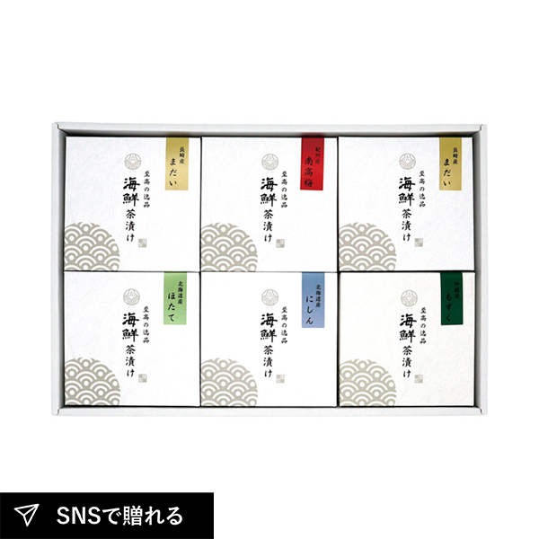 | 長崎県産まだい水煮×2、北海道産ほたて水煮・北海道産にしん甘露煮・紀州南高梅・沖縄県産もずく×各1、だしつゆ・茶漬け薬味×各6 |